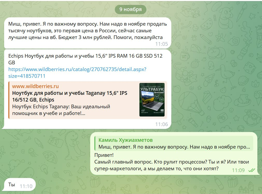 Проблема была в следующем. Да, Камилю пообещали особые условия; да, Wildberries поставил на этот ноут прям невероятно вкусную цену; но о том, что этот ноут на Wildberries продается по столь вкусной цене, нужно было РАССКАЗАТЬ НАРОДУ. Ну, чтобы обеспечить МГНОВЕННЫЙ и МАСШТАБНЫЙ приток живого теплого трафика. И вот эту задачу маркетплейс возложил уже на самого Камиля. Будет продано 3 000 ноутов за месяц с хвостиком – дадим ОСОБЫЕ УСЛОВИЯ на 2026 год, не будет продано – пойдешь туда же, куда идут все остальные селлеры, а именно снова в яйцезакруточную комнату.
