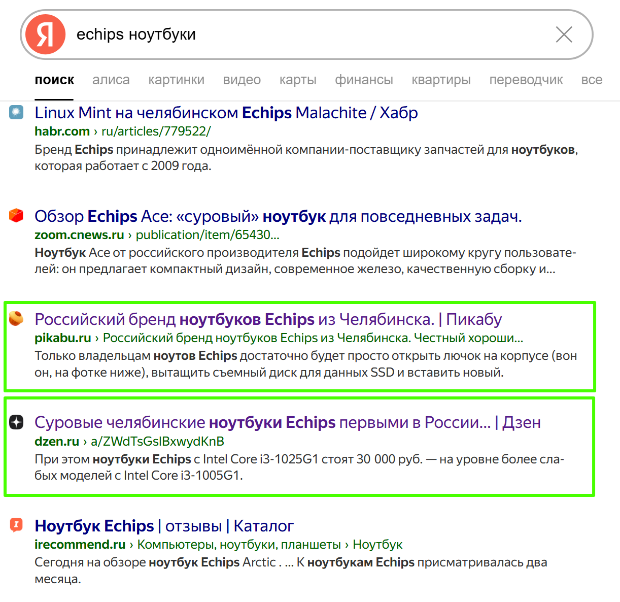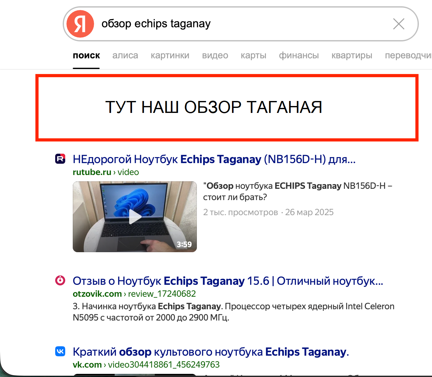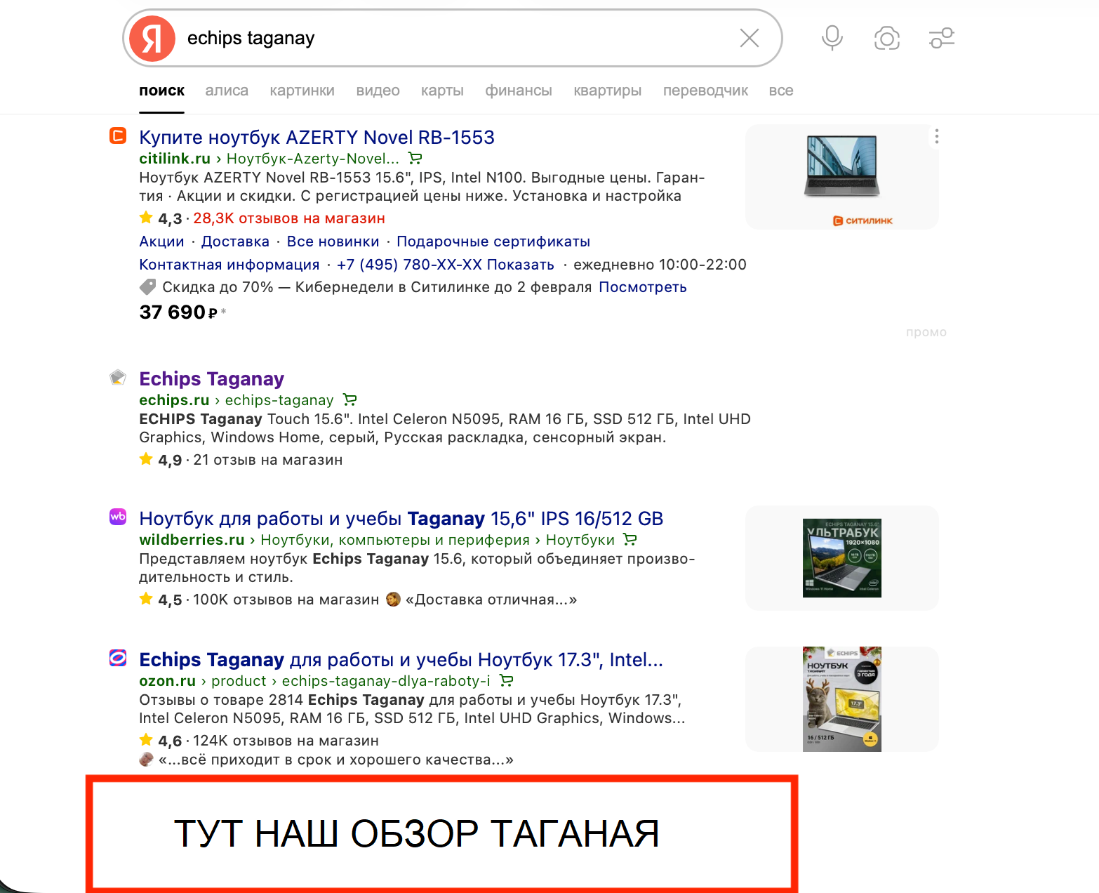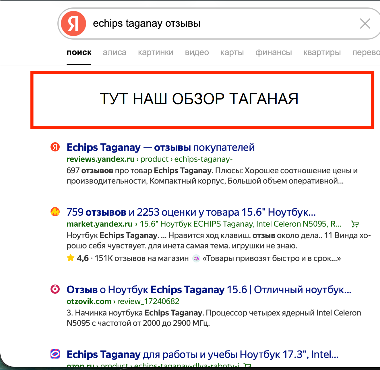 Первое, что мы сделали после написания концепта, – запилили две статьи. Первую – на крупном гаджетно-технологическом ресурсе: это был короткий, но емкий обзор именно Echips Taganay с упором на актуальные тезисы позиционирования. Т. е. мы не просто рассказали, что ноутбук умеет, но и пояснили, что стоит он всего 20 тысяч и только на Wildberries. И что это действительно уникальное предложение. Подобная статья была необходима, так как после просмотра грядущей рекламы некоторая часть зрителей отправится искать этот самый Taganay в интернетах. Ну, чтобы почитать о нем подробнее и принять решение о покупке. Вот нам как раз и надо было, чтобы эта часть зрителей «напарывалась» не на абы какой обзор, а на обзор, написанный с учетом нашего правильного позиционирования. Любопытно, кстати, что в выдаче на тот момент уже имелся обзор Echips Taganay, написанный каким-то левым автором. Обзор был в целом позитивным, но нужных тезисов позиционирования не содержал. Ну, что поделать – пришлось его из выдачи выдавить.
