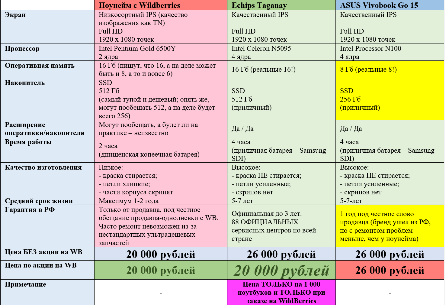 20 тысяч – была прям очень, очень, ООООЧЕНЬ вкусная цена для такого компьютера! Вот вам документ-концепт для всей кампании, в котором мы сравнили Taganay с аналогами – как безымянными китайскими, так как разного рода «Асусами». Коротко: китайцы – ломучее говно без гарантии, а стоят те же 20 тысяч; «Асусы» и прочие «Эйсеры» – тоже де-факто не имеют гарантии в России, плюс у них меньше памяти и менее емкие накопители, а стоят они не менее 26 тысяч рублей.