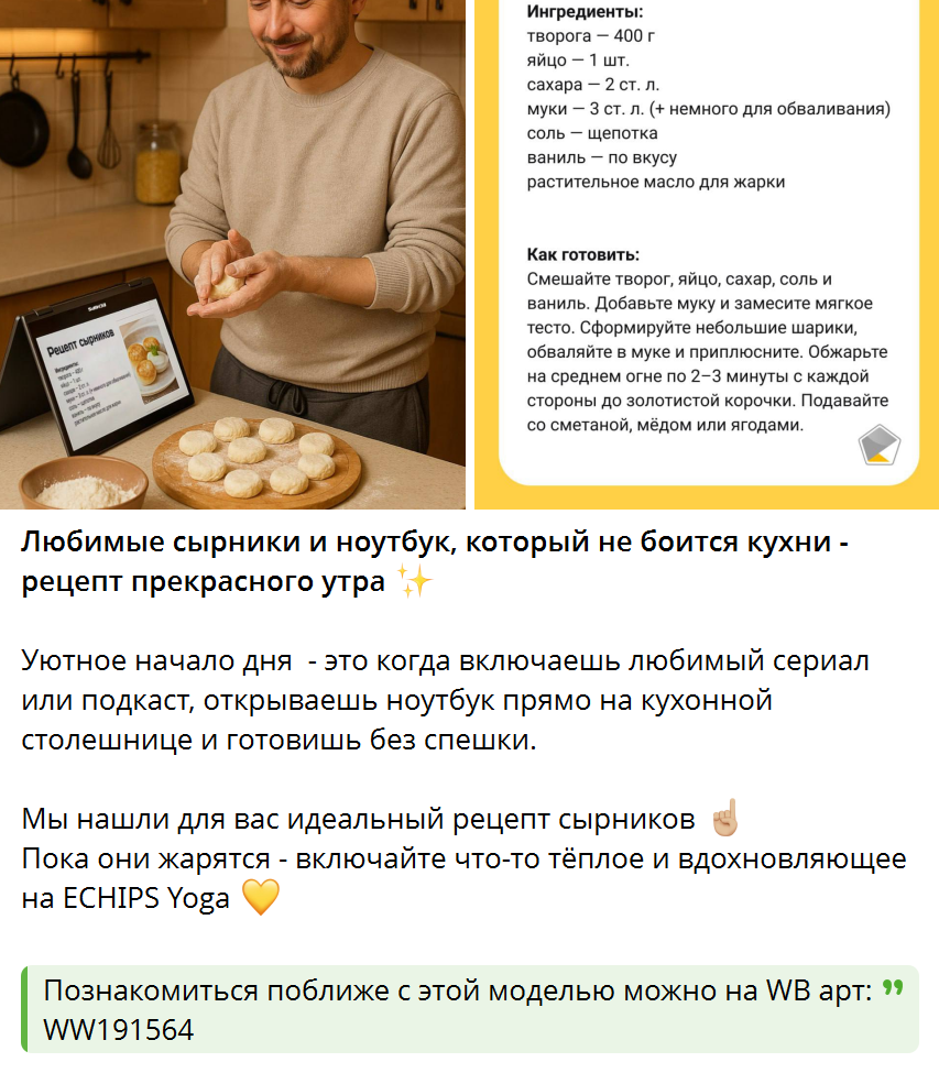 Рецепты, блять, сырников! И какой-то ноутбук, который ПОЧЕМУ-ТО не боится кухни… Плюс предложение поискать этот ноутбук на WB по – внимание! – АРТИКУЛУ! То есть дать прямую ссылку религия СММ-щика почему-то не позволила… В общем, классический типовой SMM! Как в больших корпорациях! Для галочки! Бессмысленный и беспощадный!