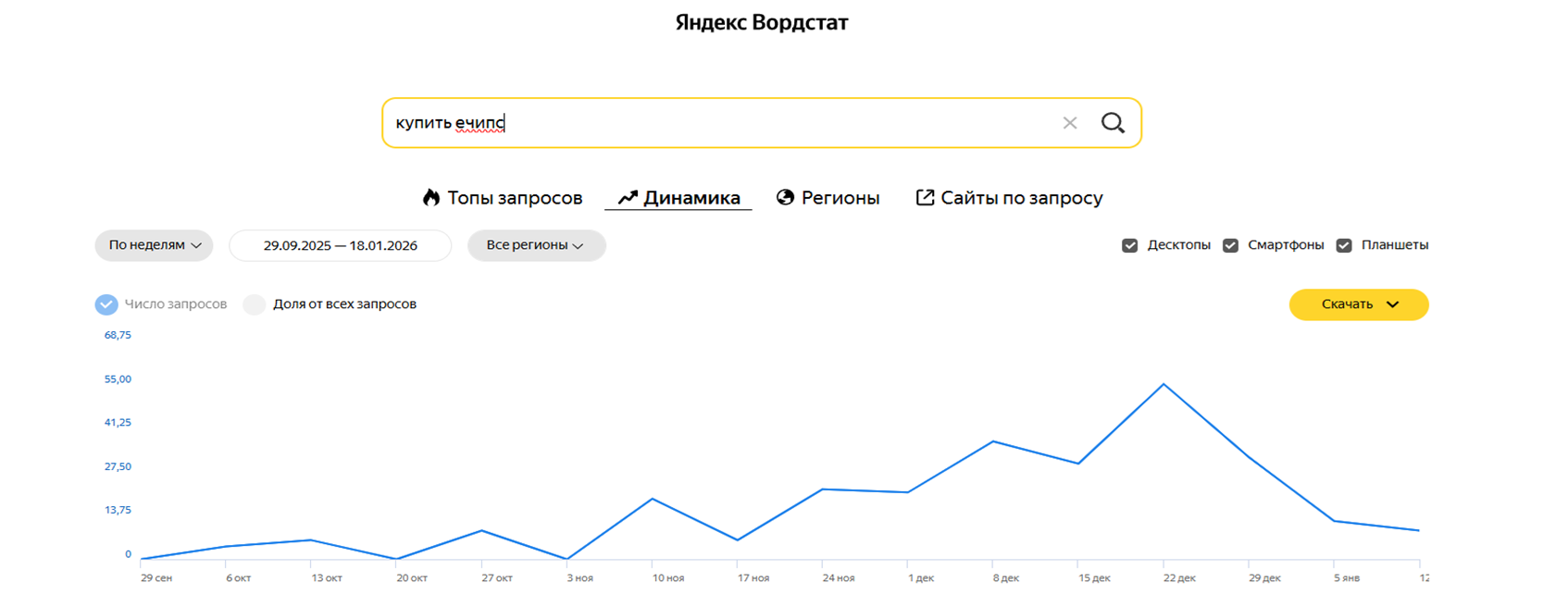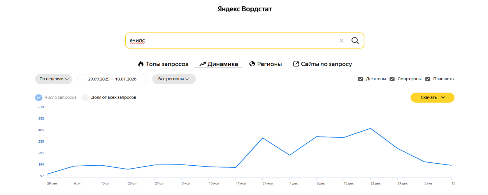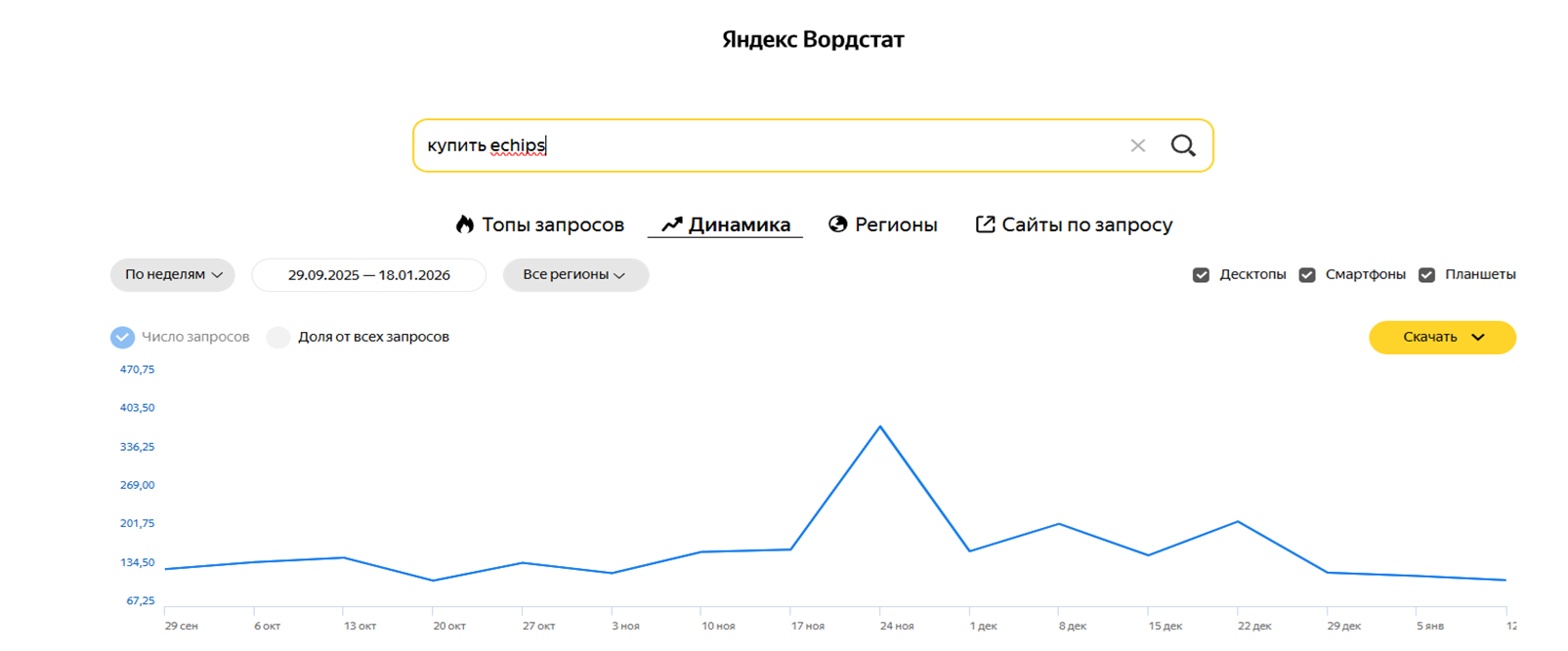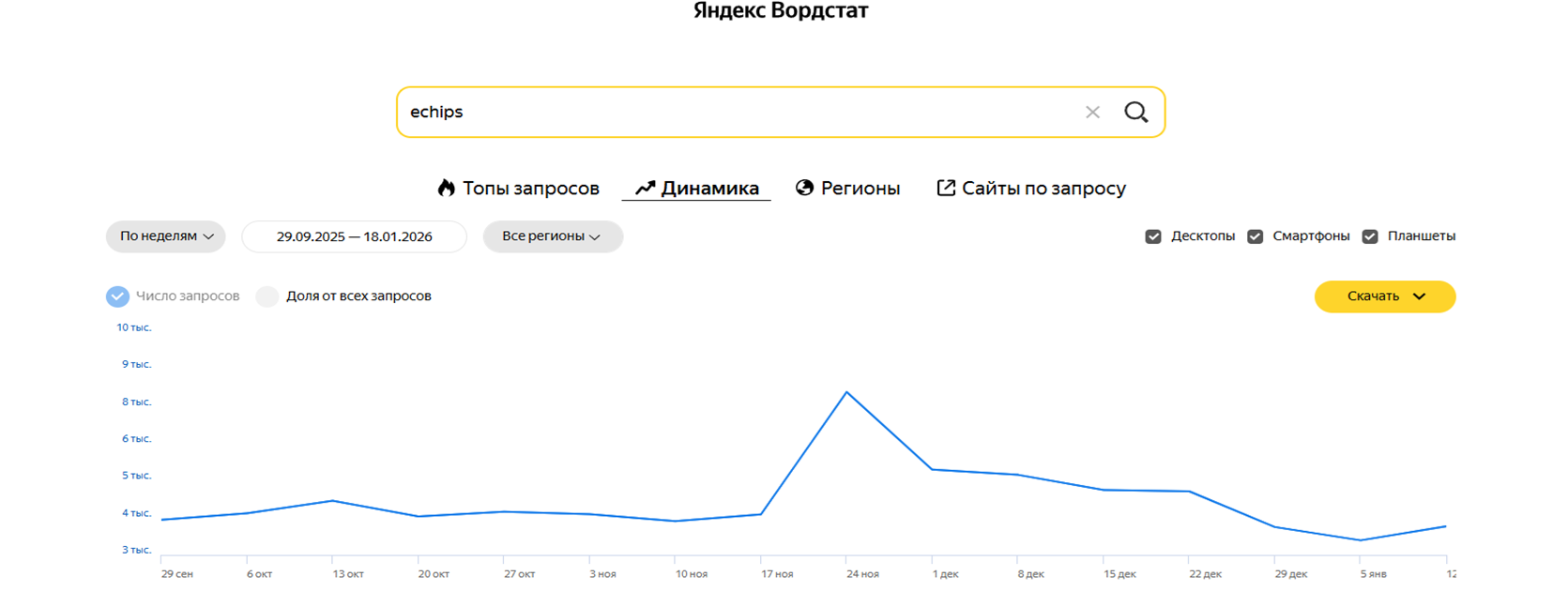Тут вот еще что сказать. Смотрите, как во время нашей кампании росли запросы в «Яндекс» по фразе «Echips Taganay»: