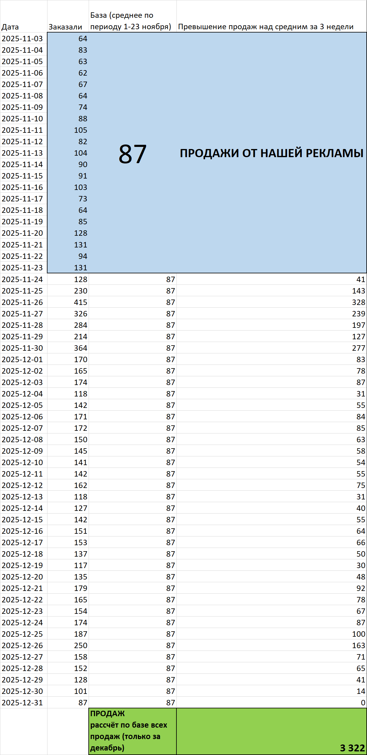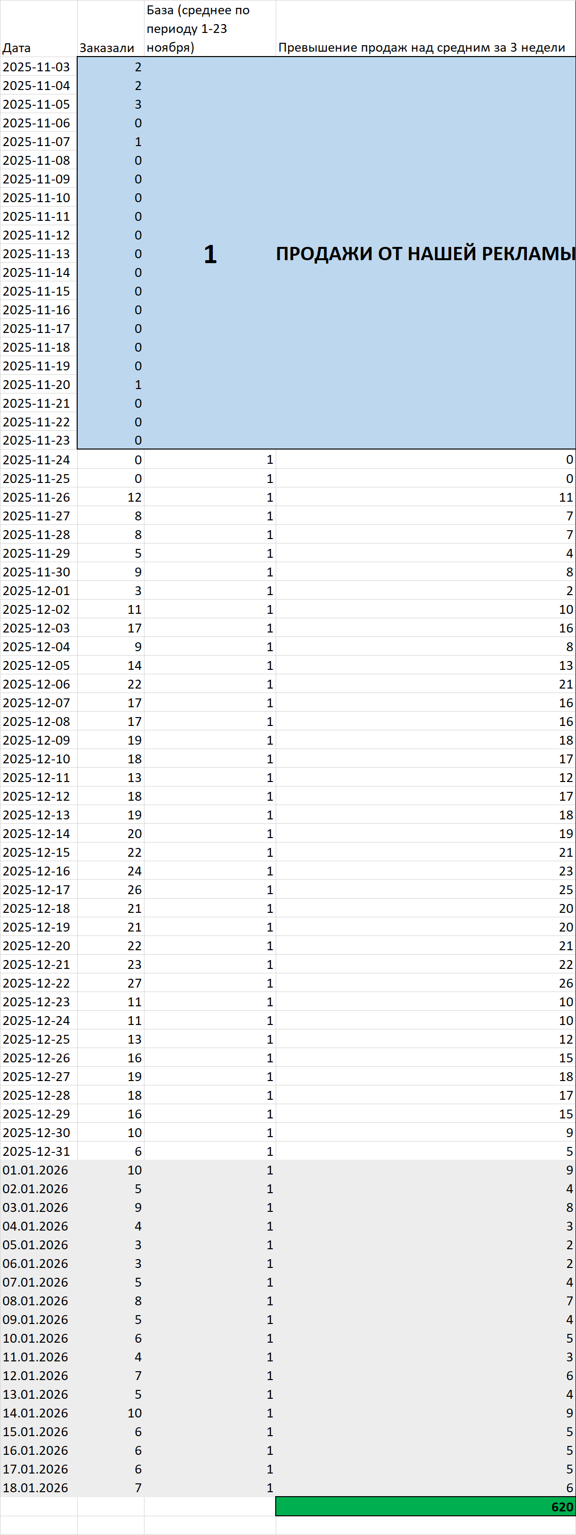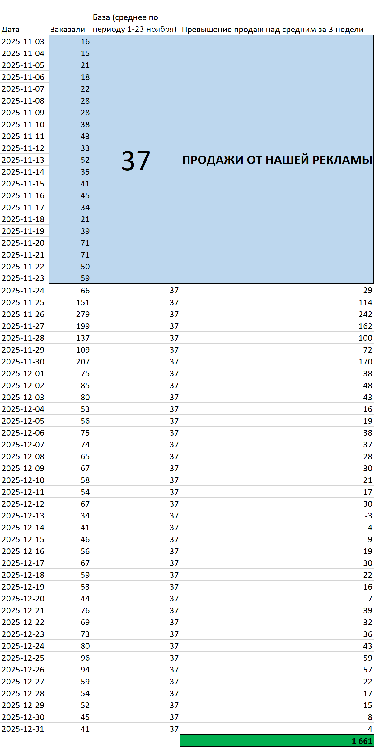 О чем это говорит? Во-первых, если посмотрите внимательно, увидите, что средние продажи ДО старта кампании были скорее 0, чем 1. Но на всякий случай (пессимизируем результат!) мы поставили 1 продажу в день в качестве базы.
