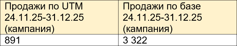 Получилось, что в рамках рекламной кампании мы сделали 36 трафиковых размещений в Telegram и на YouTube (не считая 2 статей) – и получили в период с 24 ноября по 31 декабря 2025 следующие цифры: 891 продажу по UTM; 3 322 продажи, если считать по вышеозначенной методике «суммирование по базе». В виде таблички это выглядит следующим образом:
