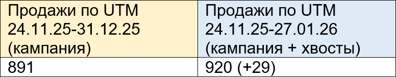 Едем дальше. Подтянутся дополнительные хвосты от размещений. Не все люди ведь смотрят посты у тех же блогеров сразу же; некоторые – спустя дни, недели и даже месяцы после выхода (особенно это характерно для видео-интеграций). Народ увидит информацию о прекрасных ноутбуках Echips – и отправится покупать. Собственно, по состоянию на последнюю точку замера – 27 января – только по UTM-меткам у нас уже было 920 продаж. Вот, сравните: